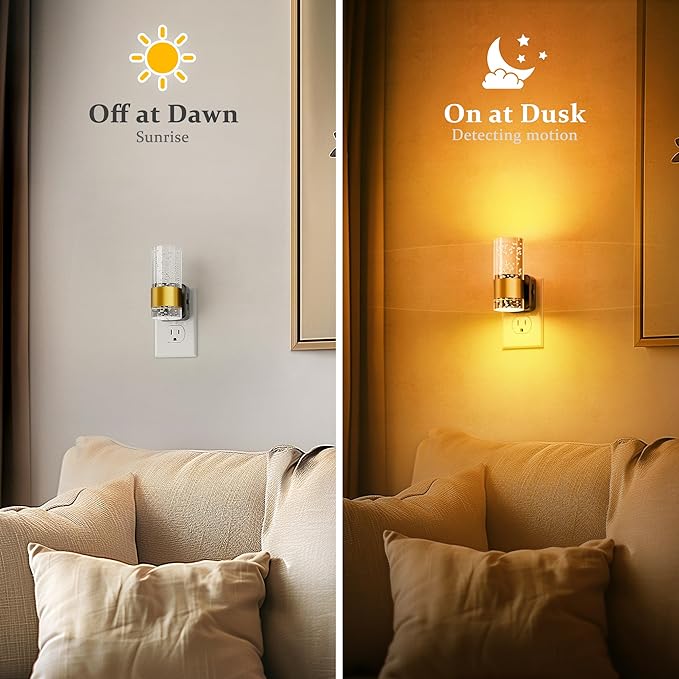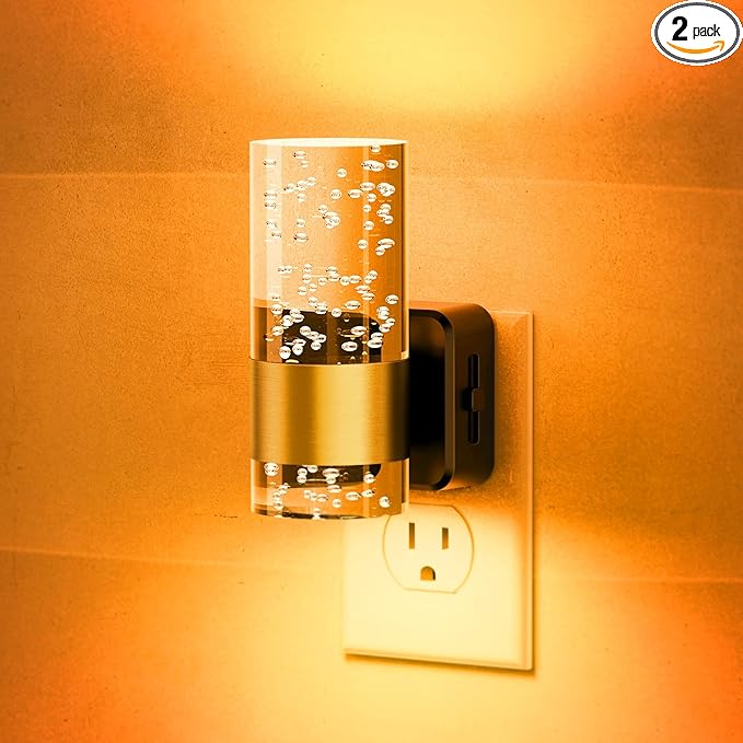 - Modern Night Light:This plug-in bubble night light features a sleek, wall sconce-style design that emits light both upward and downward. Accented with a gold ring, it adds elegance and sophistication, making it a perfect indoor lighting solution for bedrooms, living rooms, and hallways.