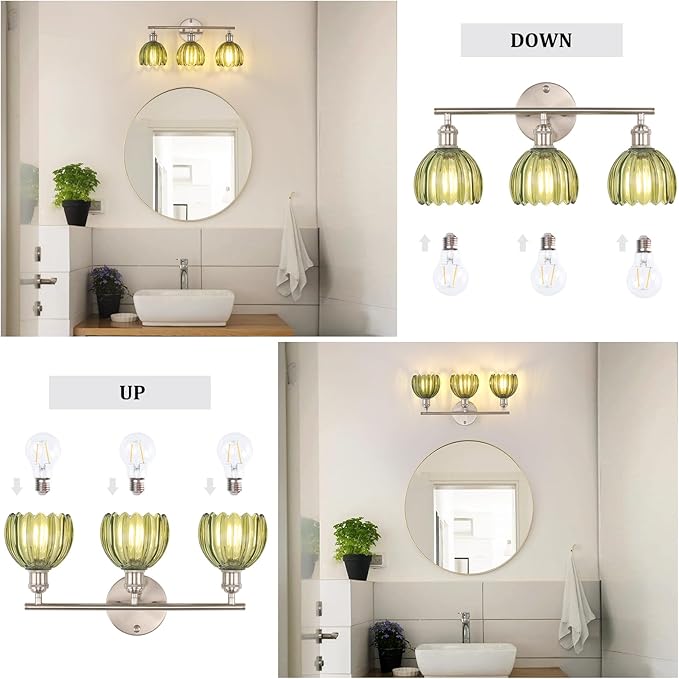Bathroom Light Fixtures, 3-Light Vanity Wall Light Over Mirror with Green Tulip Glass Shade for Bedroom Living Room (Bulb Not Included), Satin Nickel