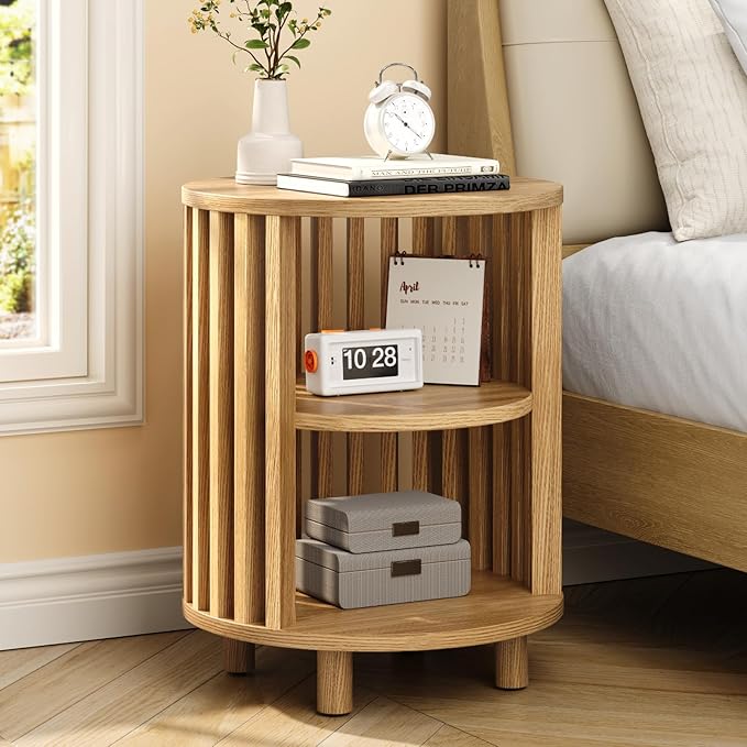 Round End Table, Wood Bedside Table, Mid Century Modern Nightstand with Open Storage Shelf, 3 Tier Small Side Tables for Living Room, Bedroom, Curved Profile Design, Natural Oak(2-Pack)