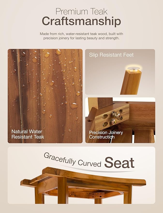 - Premium Teak Wood: Expertly crafted from rich, natural teak wood for superior water resistance, exceptional strength, and timeless elegance. This teak shower bench with precision joinery ensures enduring beauty, even in steamy spa, bath, or sauna settings