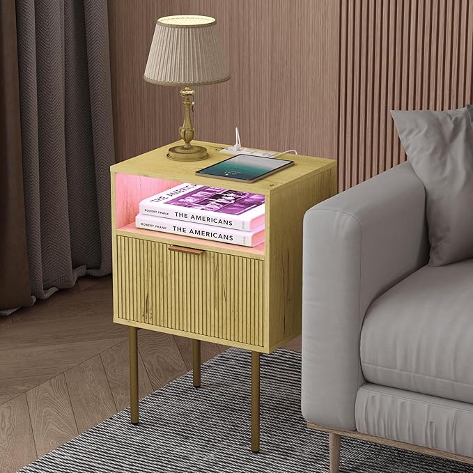 Nightstand with Charging Station, Bedside Table with Storage Drawer, Fluted Side Table for Living Room, Bedroom