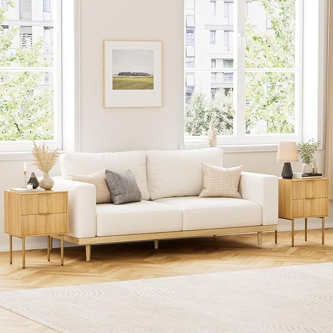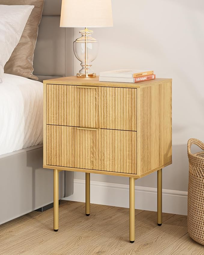Masupu Night Stand,Mid-Century Modern Bedside Table with 2 Storage Drawer,Small Gold Frame Side End Table for Bedroom,Living Room, Natural