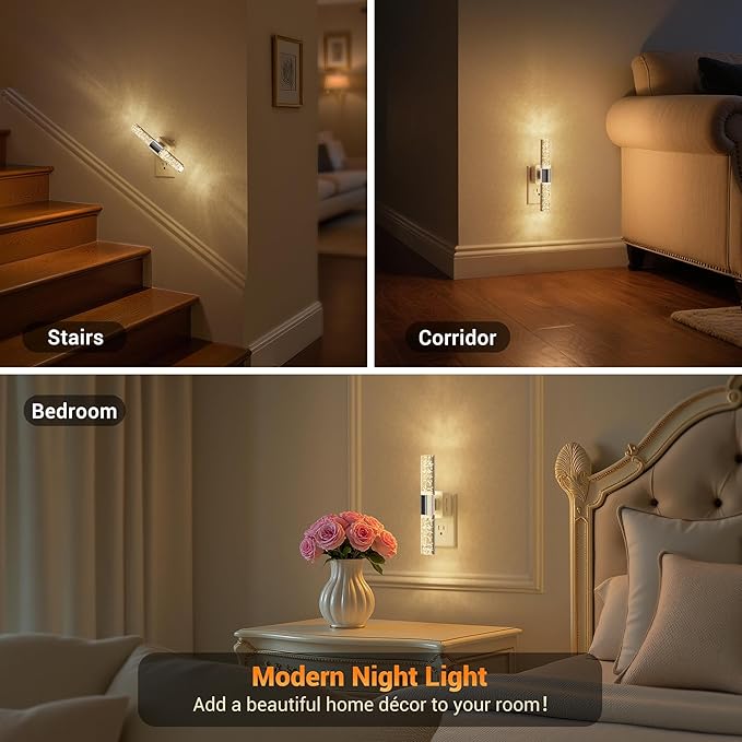 - Dimmable Night Light: This night light features a sliding dimmer switch integrated into the plug base, enabling effortless brightness adjustment for varied environments. Whether creating a soft ambiance for bedtime or enhancing visibility, this wall-plug night light adapts to diverse lighting needs with customizable intensity