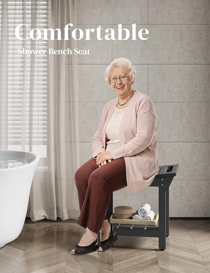 Waterproof Shower Bench, Poly Lumber Shower Stool for Shaving Legs, Shower Chair Seat with Storage Shelf and Handles, Bathroom Bench for Inside Shower, Non-Slip (Grey)
