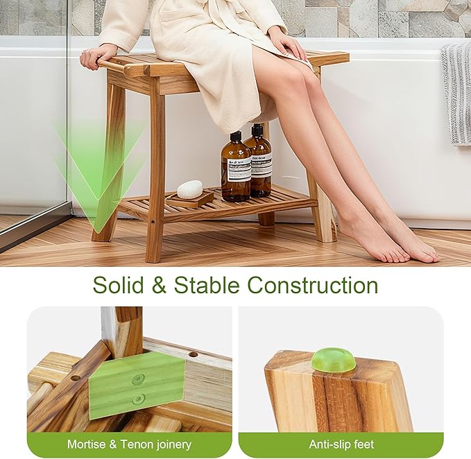 - 【WATERPROOF AND SLIP-RESISTANT】Engineered for total safety and peace of mind. Four non-slip rubber feet lock the stool firmly in place, protecting your floors and preventing accidents. Combined with teak's innate waterproof properties, this bench guarantees exceptional durability and a secure showering experience in wet environments.