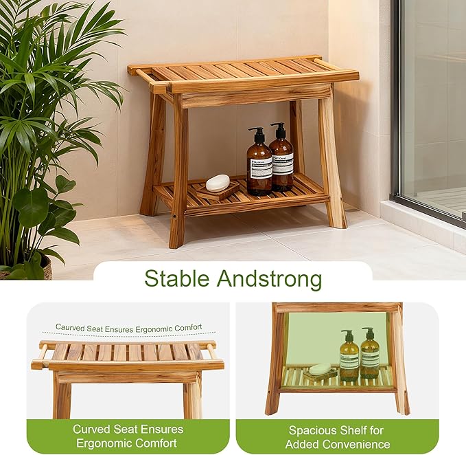 - 【MULTIFUNCTIONAL STORAGE SHOWER STOOL】Keep your shower essentials perfectly organized and within arm's reach. This teak stool features a 2-tier storage shelf for towels, bottles, and toiletries. It also includes a dedicated showerhead caddy and dual-side handles that double as a towel bar, combining multiple functions into one elegant, space-saving design for ultimate convenience.