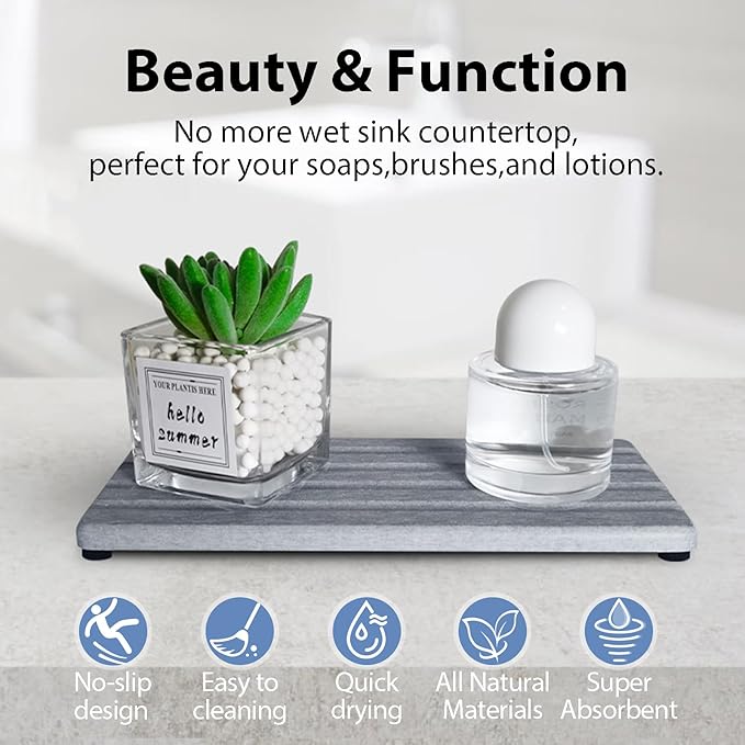- 【Multifunctional】This versatile diatomite tray works perfectly for bathroom sinks and kitchen counters. Ideal as a drying base for soap, cups, hand soap bottles and cosmetics. Keeps surfaces dry and tidy for a cleaner, more organized space.