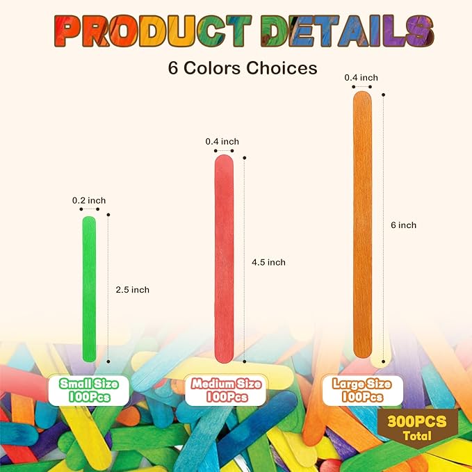 - 3 SIZES STICKS: We provide three mixed-size colored wood sticks: small (2.5 inches), medium (4.5 inches), and large (6 inches). They come in 6 different colors: yellow, green, purple, blue, red, and orange, which can meet your various color combinations when making exquisite crafts. NOTE: Do not immerse in water—colors may fade or run when wet.