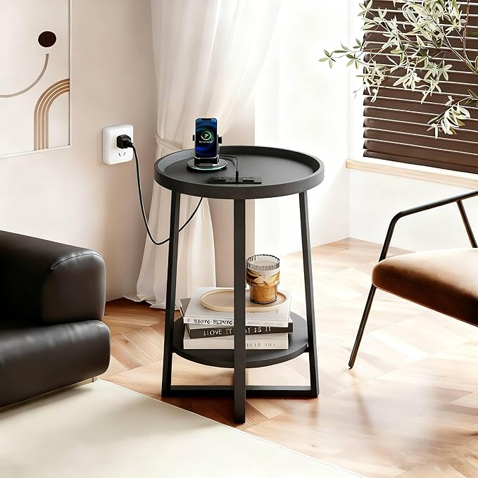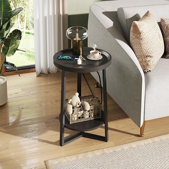 - 2-Tier Round End Table: WLIVE end tables with 2 usb ports and 2 outlets, and a 6.5-ft charging cable for convenient charging and wide mobility. Its smooth rounded edges prevent scratches. The 2-Tier open shelf makes grabbing items effortless, so you never have to worry about battery life or storage while sitting nearby