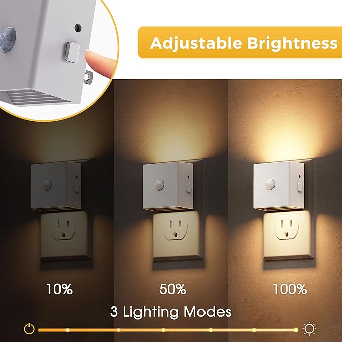 - Dimmable Night Light -- The button on the side of this plug in night light can adjust the brightness 10/50/100LM to meet your different brightness needs.