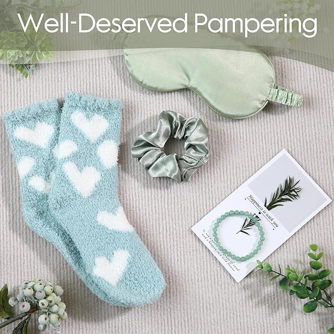 - Multi-Use Wellness Kit - 16 essential items including handmade soap, bath salt, bath bomb, essential oil, hand cream, comb, silk eye mask, insulated water bottle, bracelet, socks, candle and greeting card