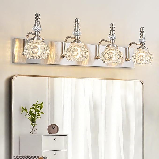 Modern Glass Crystal Vanity Light - Vintage Bathroom Lighting Fixtures Over Mirror, 4 Light Vanity Lights G9 Bulb (27.55 Inch, Nickel)