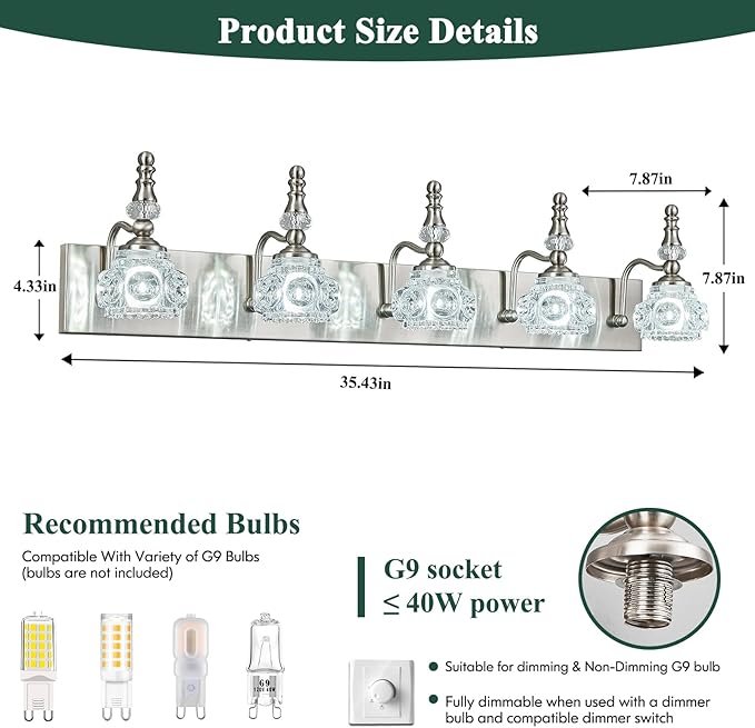Modern Glass Crystal Vanity Light - Vintage Bathroom Lighting Fixtures Over Mirror, 5 Light Vanity Lights G9 Bulb (35.43 Inch, Nickel)