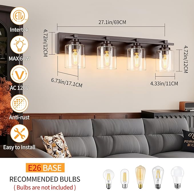 - 【E26 Standard Socket】Our bathroom light fixtures over mirror are compatible with E26 standard base bulbs,you can use leds, incandescent bulbs, energy-saving bulbs. In addition, they also work well with dimmers to adjust lighting.(Up to 60W, bulb and dimmer switch are not included). Ideal for bathroom lights over mirror, mirror cabinets, dressing table, reading light, wall sconces, living room, bedroom, hallway, kitchen, staircase, corridor, and so on.