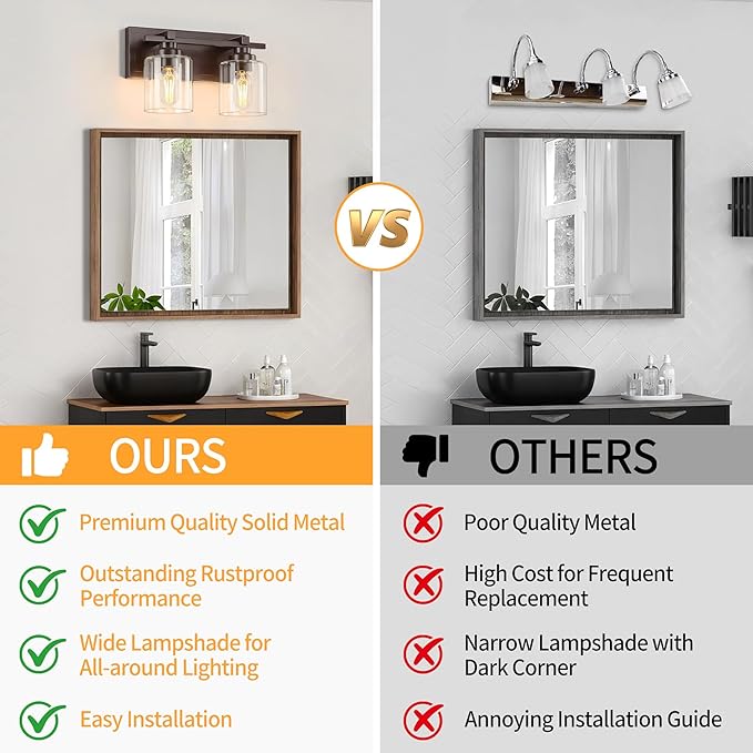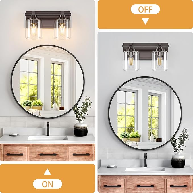 - 【Upgrade Unique Design】 The high quality metal base of oil rubbed bronze finish bathroom vanity lights, exudes a simple and pure beauty, reflecting a high quality texture. Combined with the clear glass shade hue, it shows a sophisticated modern style. They are also resistant to rust and corrosion, ensuring their longevity and reliability. Say goodbye to frequent replacements and enjoy the beauty of bathroom lighting fixtures for years to come.