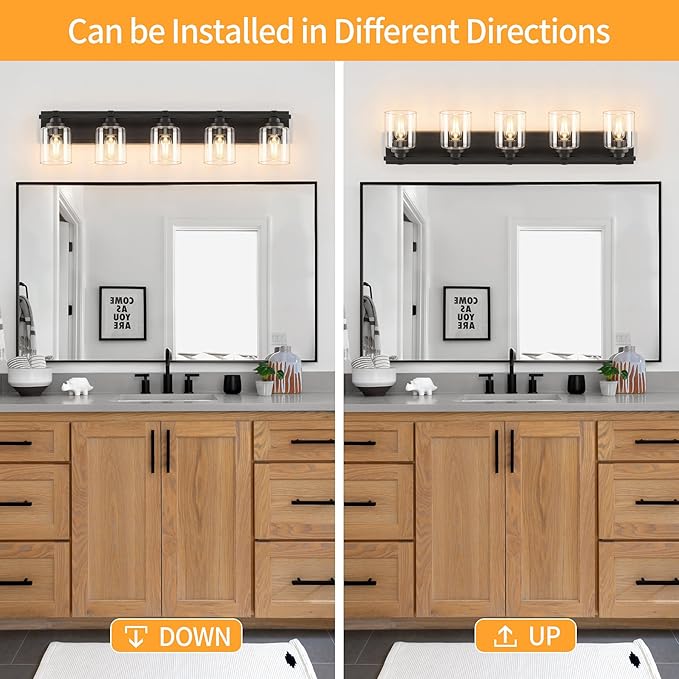 - 【Upgrade Unique Design】 The high quality metal base of black bathroom vanity lights, exudes a simple and pure beauty, reflecting a high quality texture. Combined with the clear lass shade hue, it shows a sophisticated modern style. They are also resistant to rust and corrosion, ensuring their longevity and reliability. Say goodbye to frequent replacements and enjoy the beauty of bathroom lighting fixtures for years to come.