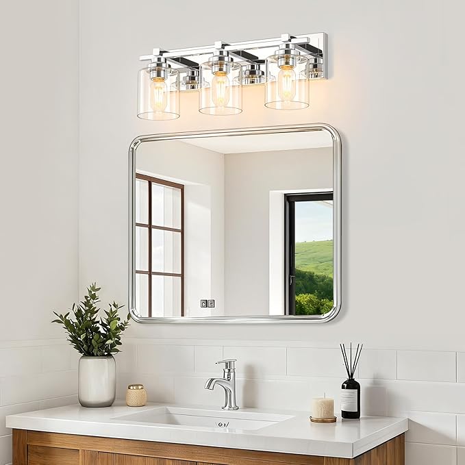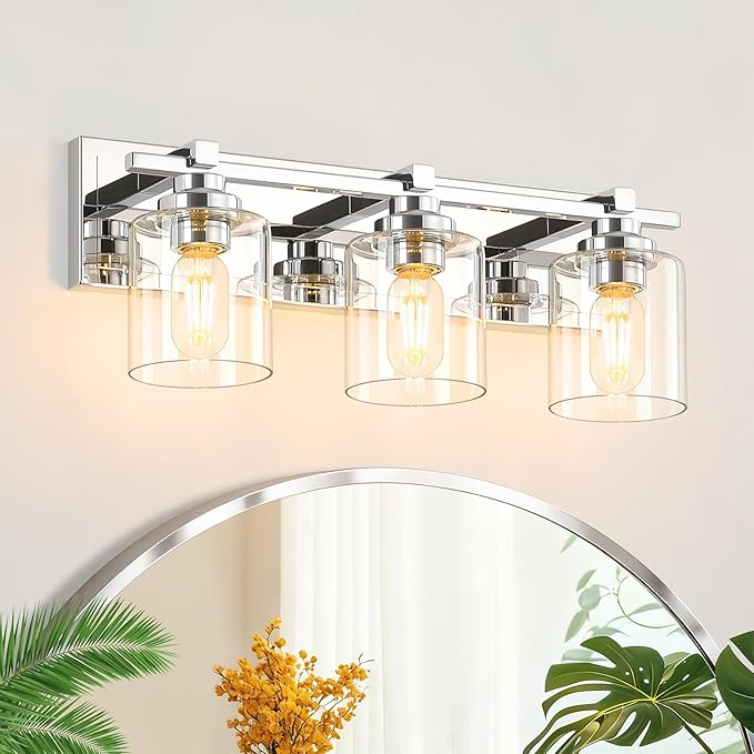3 Light Modern Bathroom Light Fixtures Over Mirror, Chrome Vanity Lights for Bathroom Wall Sconces with Clear Glass Shades, E26 Socket (Bulbs Not Included)