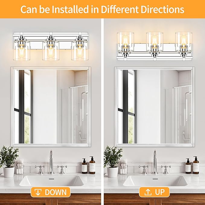- 【Upgrade Unique Design】 The high quality brushed nickel metal base of chrome bathroom vanity lights, exudes a simple and pure beauty, reflecting a high quality texture. Combined with the clear glass shades hue, it shows a sophisticated modern style. They are also resistant to rust and corrosion, ensuring their longevity and reliability. Say goodbye to frequent replacements and enjoy the beauty of bathroom lighting fixtures for years to come.