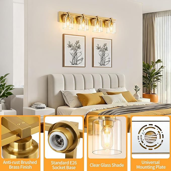 4 Light Modern Bathroom Light Fixtures Over Mirror, Brass Finish Vanity Lights for Bathroom Wall Sconces with Clear Glass Shades, E26 Socket (Bulbs Not Included)