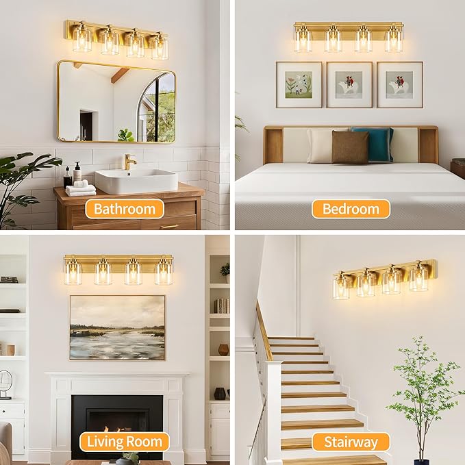- 【Upgrade Unique Design】 The high quality metal base of brass finish bathroom vanity lights, exudes a simple and pure beauty, reflecting a high quality texture. Combined with the clear glass shade hue, it shows a sophisticated modern style. They are also resistant to rust and corrosion, ensuring their longevity and reliability. Say goodbye to frequent replacements and enjoy the beauty of bathroom lighting fixtures for years to come.
