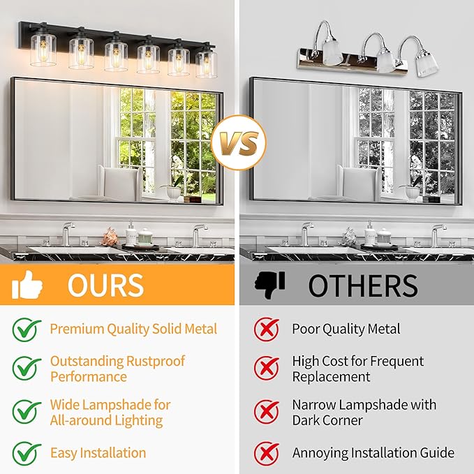 - 【Upgrade Unique Design】 The high quality metal base of black bathroom vanity lights, exudes a simple and pure beauty, reflecting a high quality texture. Combined with the clear lass shade hue, it shows a sophisticated modern style. They are also resistant to rust and corrosion, ensuring their longevity and reliability. Say goodbye to frequent replacements and enjoy the beauty of bathroom lighting fixtures for years to come.