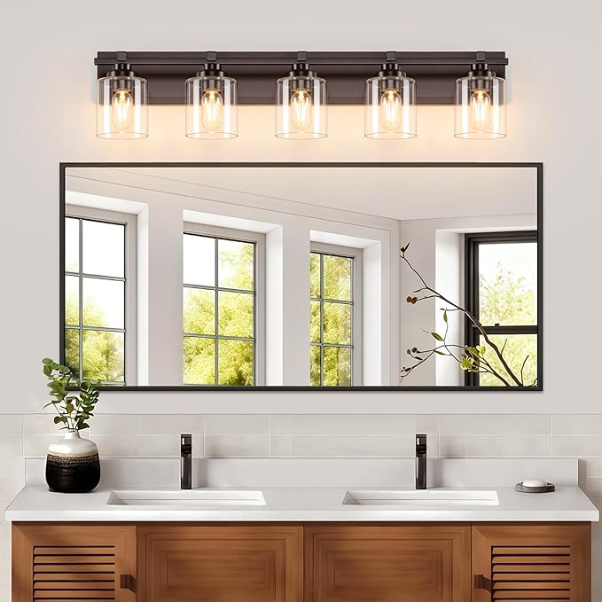 5 Light Modern Bathroom Light Fixtures Over Mirror, Bronze Finish Vanity Lights for Bathroom Wall Sconces with Clear Glass Shades, E26 Socket (Bulbs Not Included)