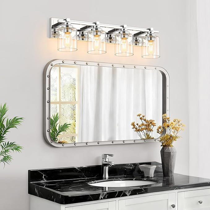4 Light Modern Bathroom Light Fixtures Over Mirror, Chrome Vanity Lights for Bathroom Wall Sconces with Clear Glass Shades, E26 Socket (Bulbs Not Included)