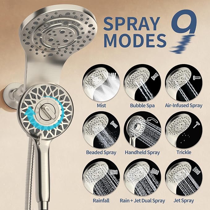 - 【9-Mode Rainfall Shower head】The large magnetic shower head offers 9 different modes. Among these, the pause function allows you to temporarily stop the water flow while lathering, helping you save water. Easily switch between modes by gently turning the knob. It uses advanced air-infusion technology to boost water pressure. By blending air and water, renter friendly dual shower heads creates a natural rainfall massage flow that hydrates every inch of your skin.