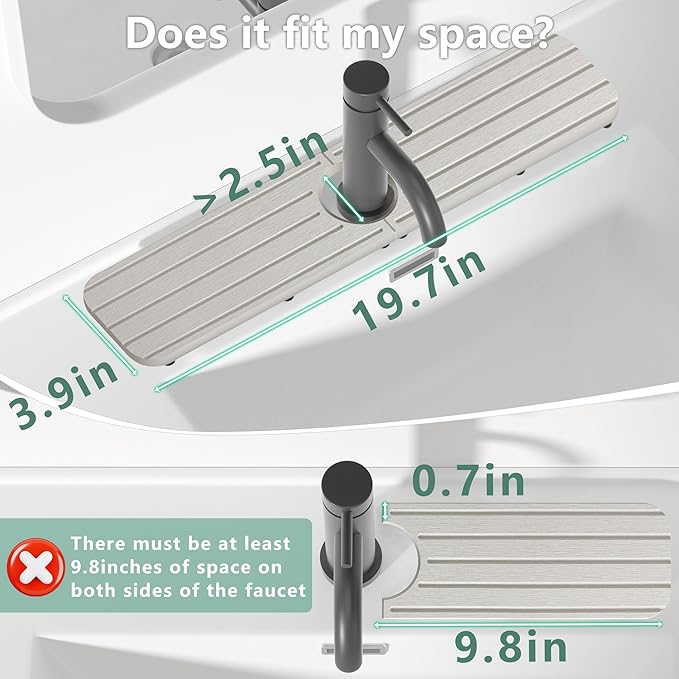 - 1.【Size Guide】: Measure your sink first. Ensure faucet and sink have no obstructions. Splash guard size: 20"L x 4"W. Center hole: 2.5" diameter.