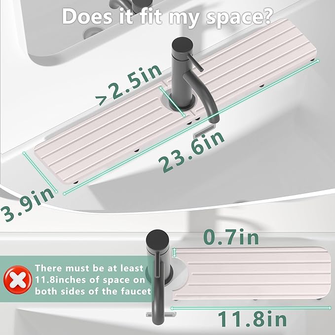 - 1.【Size Guide】: Measure your sink first. Ensure faucet and sink have no obstructions. Splash guard size: 23.6"L x 4"W. Center hole: 2.5" diameter.