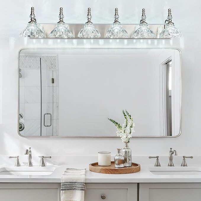 Vintage Bathroom Vanity Light, 6-Light Brushed Nickel Vanity Lighting Fixture with Flower Glass Shade, Bathroom Lighting Fixtures Over Mirror