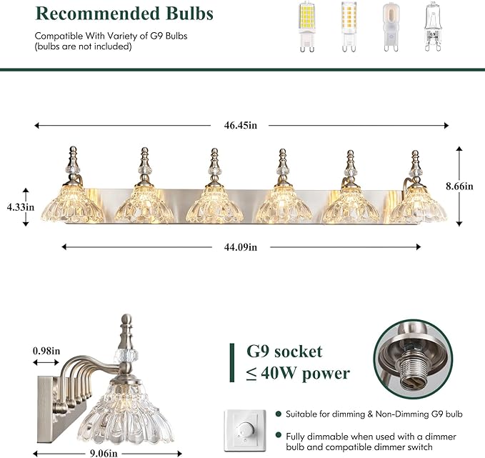 - 【Light Source】This vintage bathroom light fixtures requires 6 x G9 base bulbs, up to 40W, compatible with a variety of G9 bulbs. (Dimmable when using dimmable bulbs and compatible dimmer switch. Note:Not included)