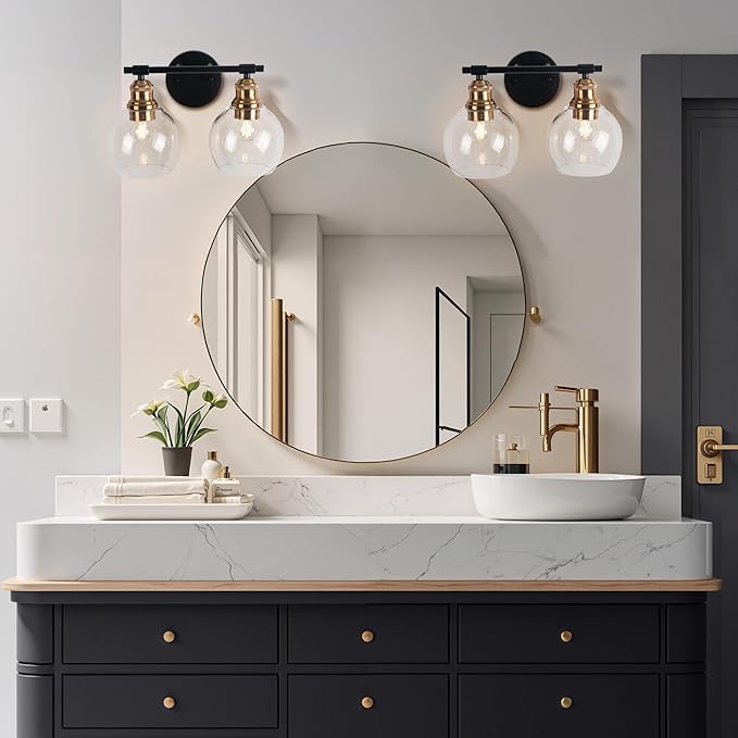 - EASY INSTALLATION: Our black and gold vanity light over mirror with the front modern light fixture bathroom is hardwired & pre-assembled. It comes with all mounting hardware for quick and easy installation. All you need to do is wiring then screw in the glass lampshades and bulbs also the Guide module is attached to the Black Vanity lights for bathroom sconce for your better understanding