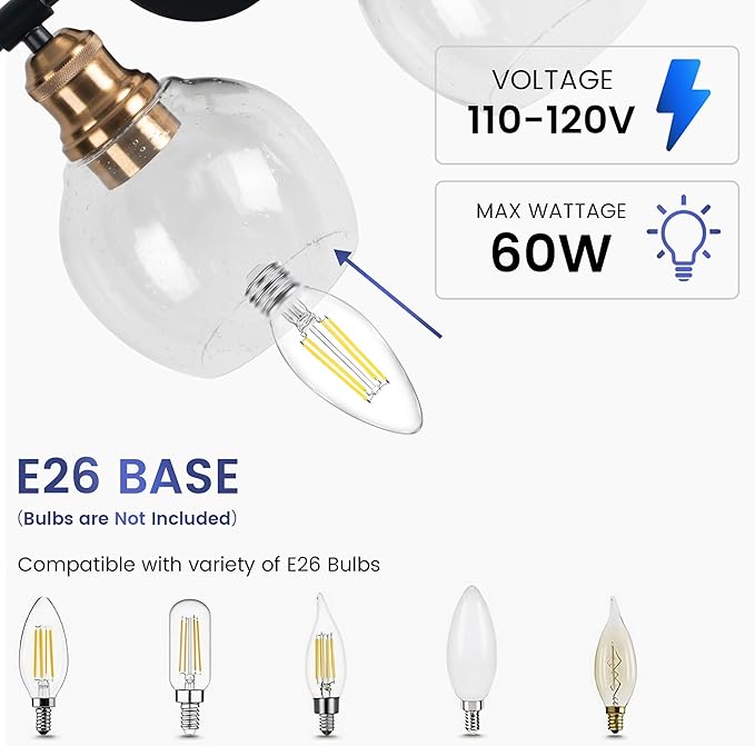 - BULBS REQUIREMENTS: Our vanity light fixture socket is compatible with all E26 base bulbs, Max 60W such as LED, CFL, incandescent, and halogen, Gold bathroom wall light are fully dimmable with a compatible dimmer switch to create the perfect atmosphere 2 light bathroom vanity light do not include Switch and Bulbs