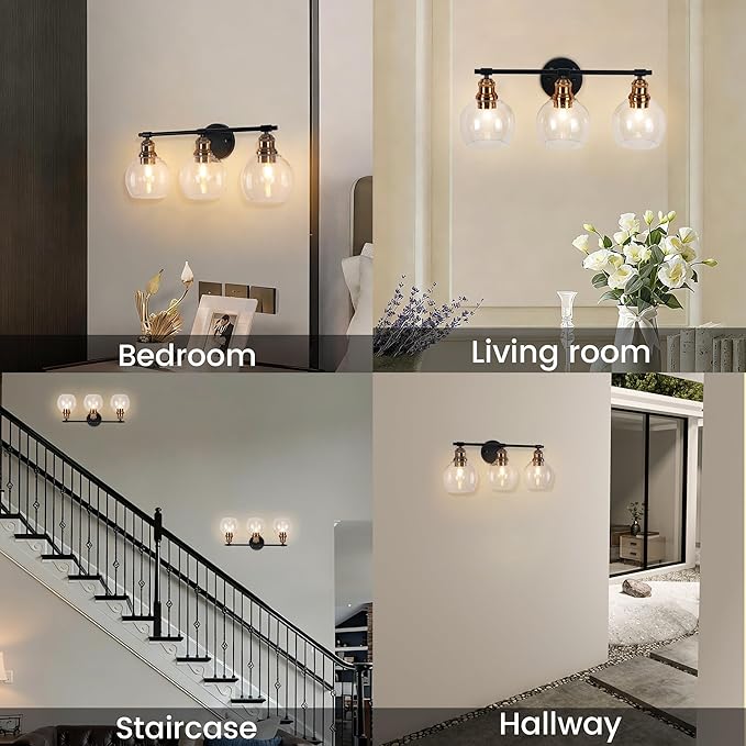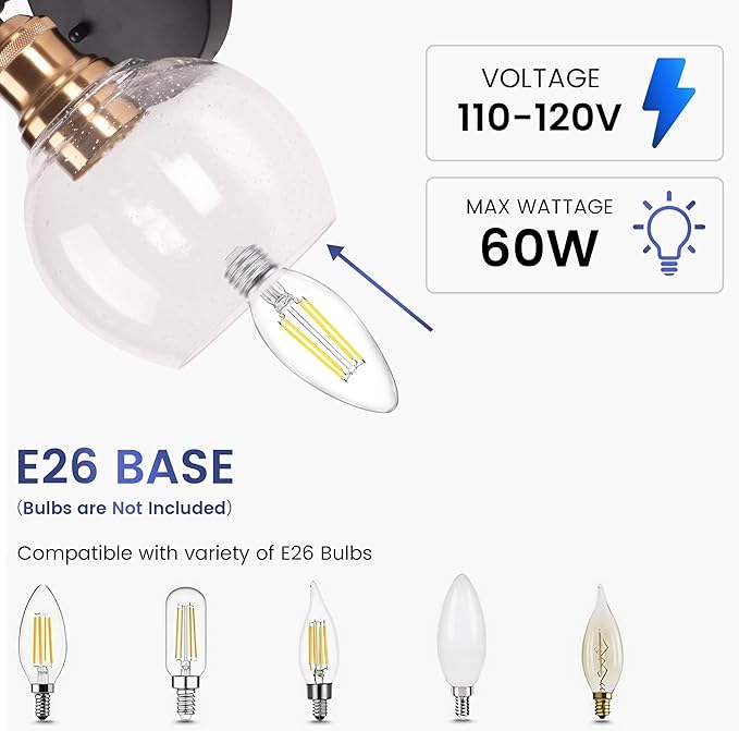 - E26 Bulbs Wall Sconce: Our vanity light fixture socket is compatible with all E26 base bulbs, Max 60W such as LED, CFL, incandescent, and halogen, black bathroom wall light are fully dimmable with a compatible dimmer switch to create the perfect atmosphere 3 light bathroom vanity light do not include Switch and Bulbs