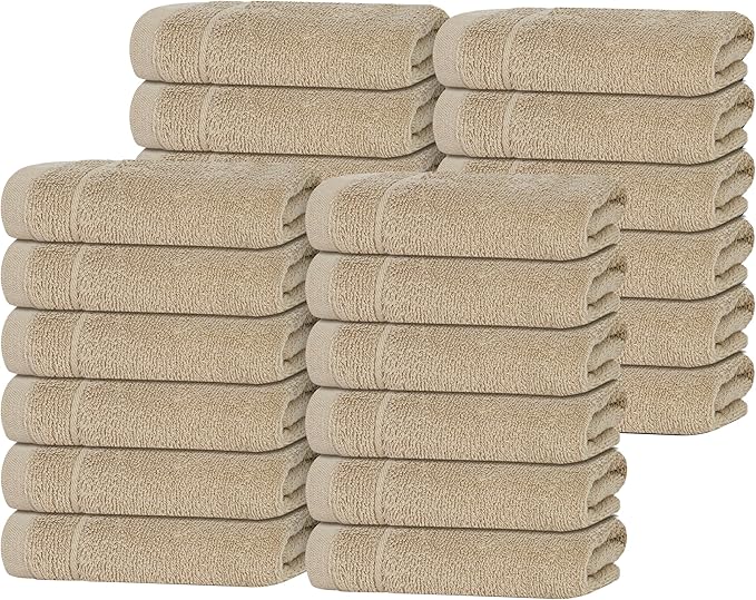 Tens Towels Pack of 24 Washcloths, 12 x 12 Inches, Lighter Weight, Quick to Dry, Super Soft & Absorbent, Gentle Face Towels, Hotel Quality, Perfect for Bathroom, Gym, Spa (Beige, 24 Pack)
