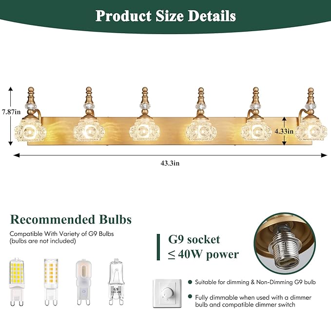 - 【Light Source】This vintage bathroom light fixtures requires 6 x G9 base bulbs, up to 40W, compatible with a variety of G9 bulbs. (Dimmable when using dimmable bulbs and compatible dimmer switch. Note:Not included)
