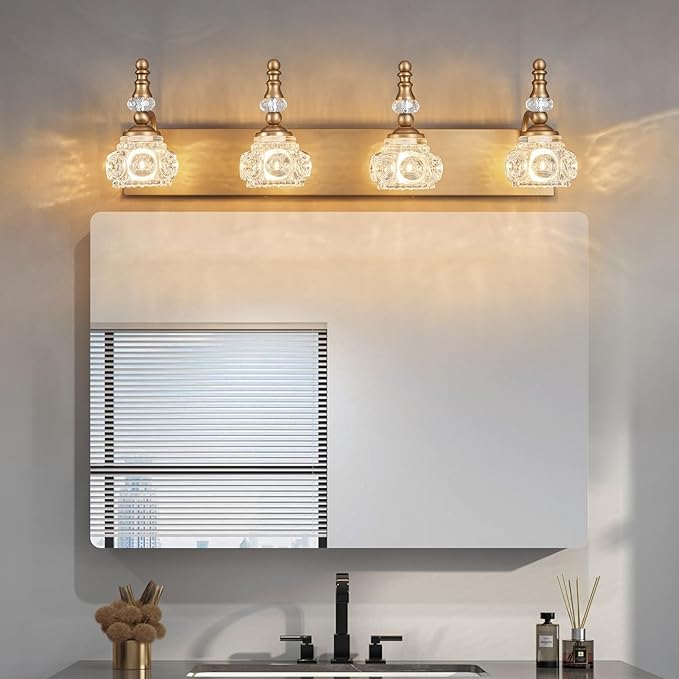 Modern Glass Crystal Vanity Light - Vintage Bathroom Lighting Fixtures Over Mirror, 4 Light Vanity Lights G9 Bulb (27.55 Inch,Brass)