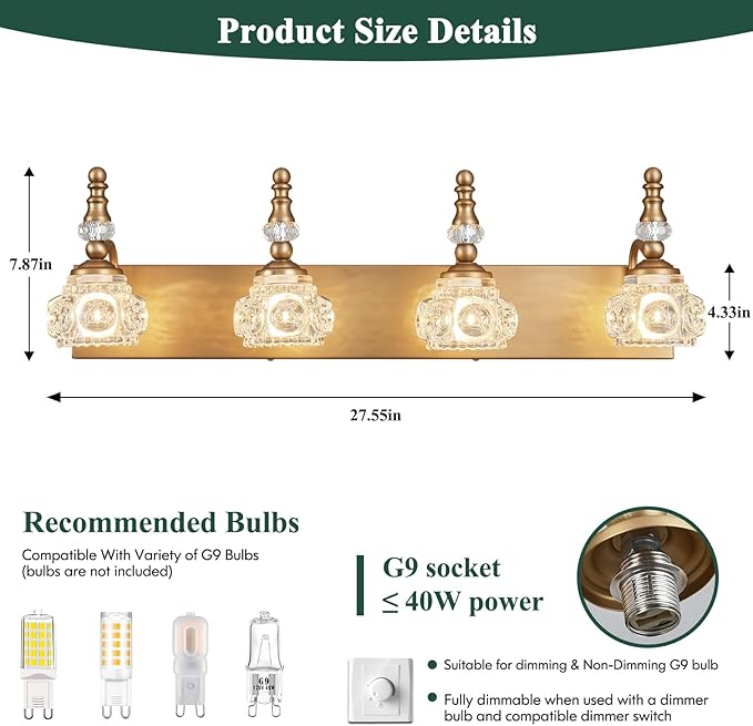 - 【Light Source】This vintage bathroom light fixtures requires 4 x G9 base bulbs, up to 40W, compatible with a variety of G9 bulbs. (Dimmable when using dimmable bulbs and compatible dimmer switch. Note:Not included)