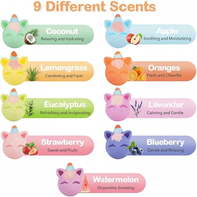 - 9 Colorful Bath Balls: This bath bomb kit set contains 9 colorful unicorn shaped bath balls. Each bath ball has a different scent, giving you an aromatic spa.