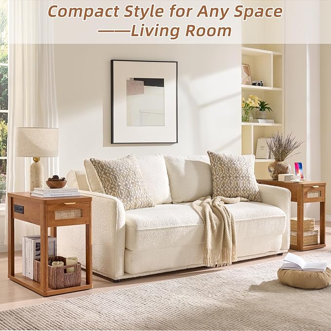 - [Versatile for Multiple Settings] The design of this charger nightstand with drawer easily adapts to various uses. Whether placed beside a sofa for convenient storage of drinks and books or next to your bed to provide essentials for the night, this bed side table seamlessly fits into your living space. Its compact design ensures it suits a range of decor styles while maximizing practicality, allowing you to enjoy the perfect blend of style and functionality in your wood bedside tables!