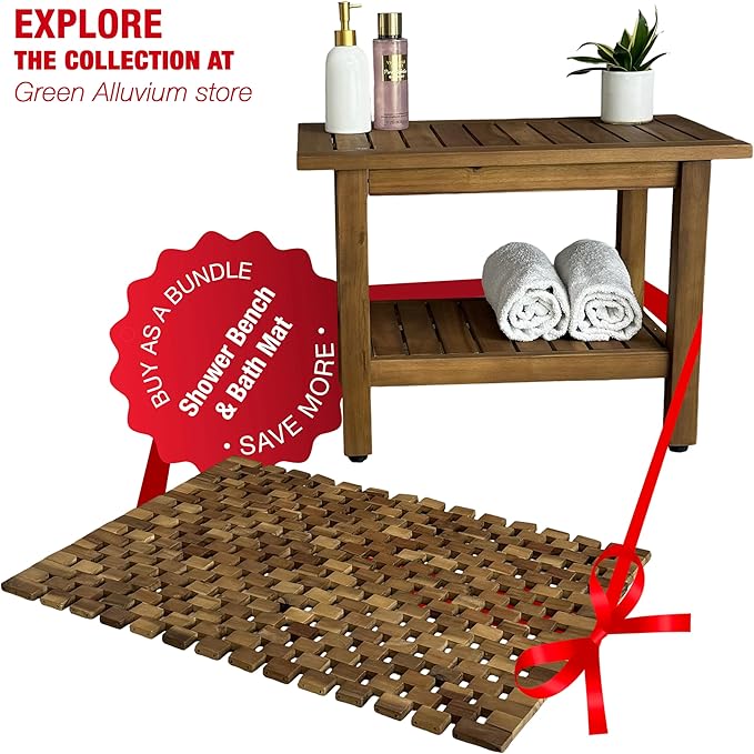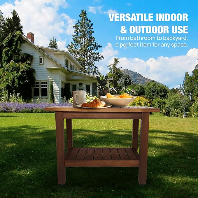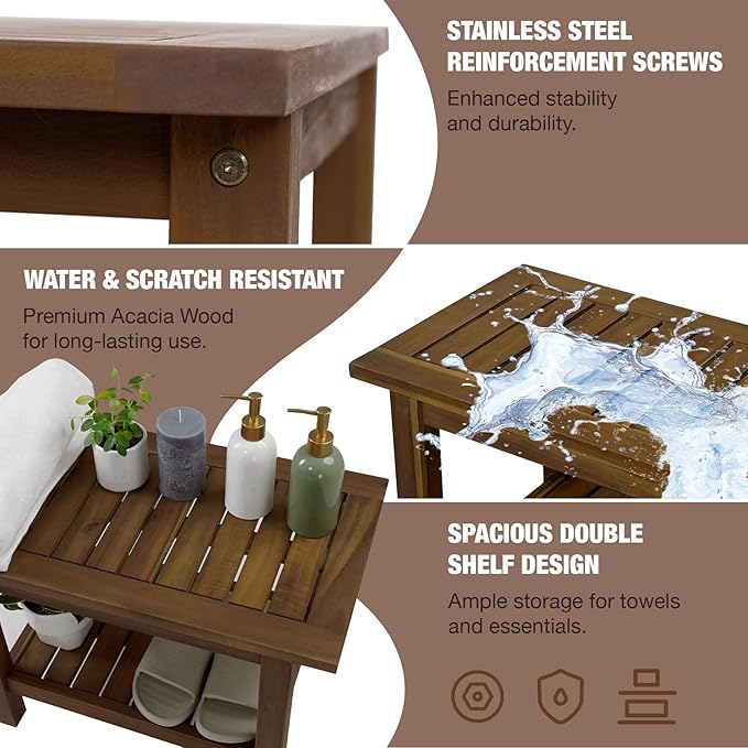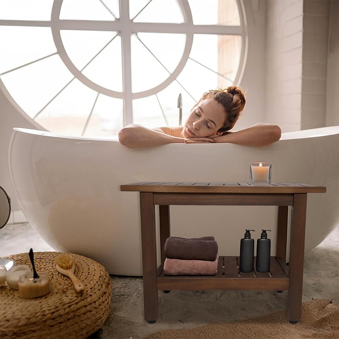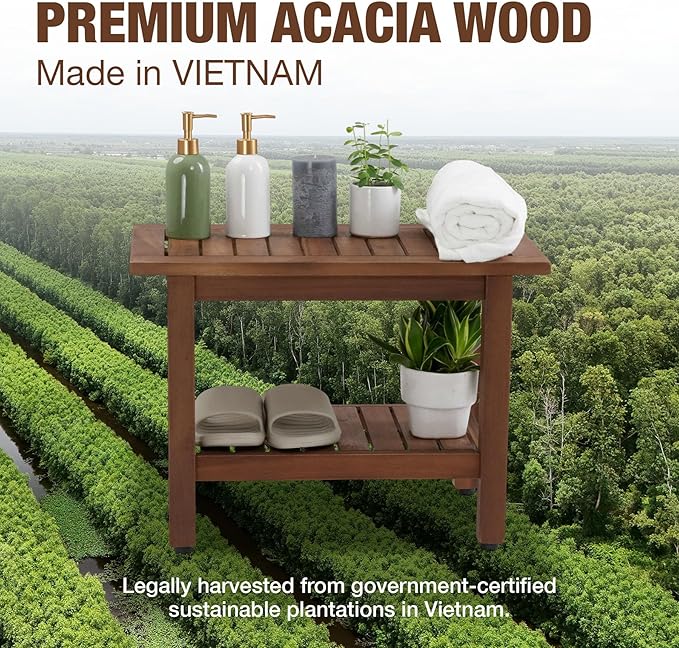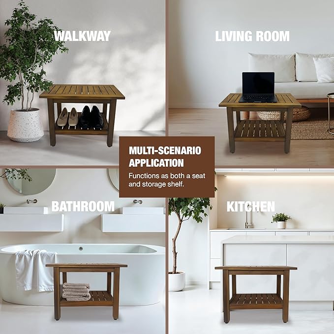24 inch Acacia Wood Shower Bench with Storage Shelf - Waterproof Sturdy Shower Stool - Shower Seats for Adults and Elderly - Bathroom Bench 350 lb Capacity