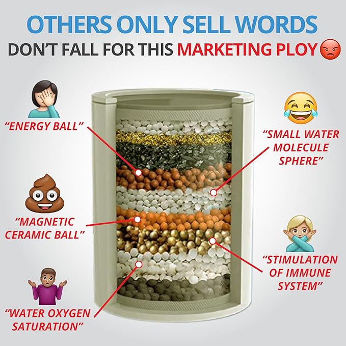 - NO BS SHOWER FILTER - Marketing gimmicks like Energy & Ceramic Balls are made of clay with no function. We use 100% REAL filtration media (sediment, carbon, KDF & calcium sulfite) for the best shower experience possible & longer filter lifetime (6 Months) by only filling up the cartridge with filter media that works.