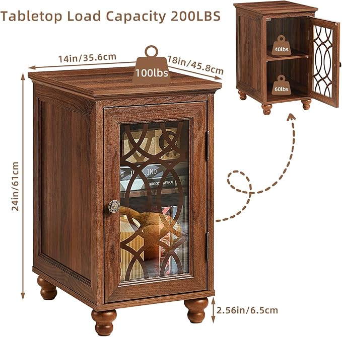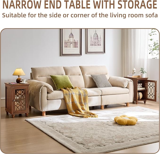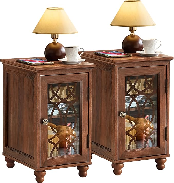 - [Narrow Side for Small Space] This charming night stand features a built-in deep storage, adding a unique touch to your home. Its Elegant decorative lines on glass doors and distinctive round gourd legs create a stunning aesthetic, reminiscent of a work of art. No matter the angle, the nightstand exudes captivating visual appeal, seamlessly blending functionality with beauty. This narrow end table is ideal for enhancing the warmth and style of your bedroom.