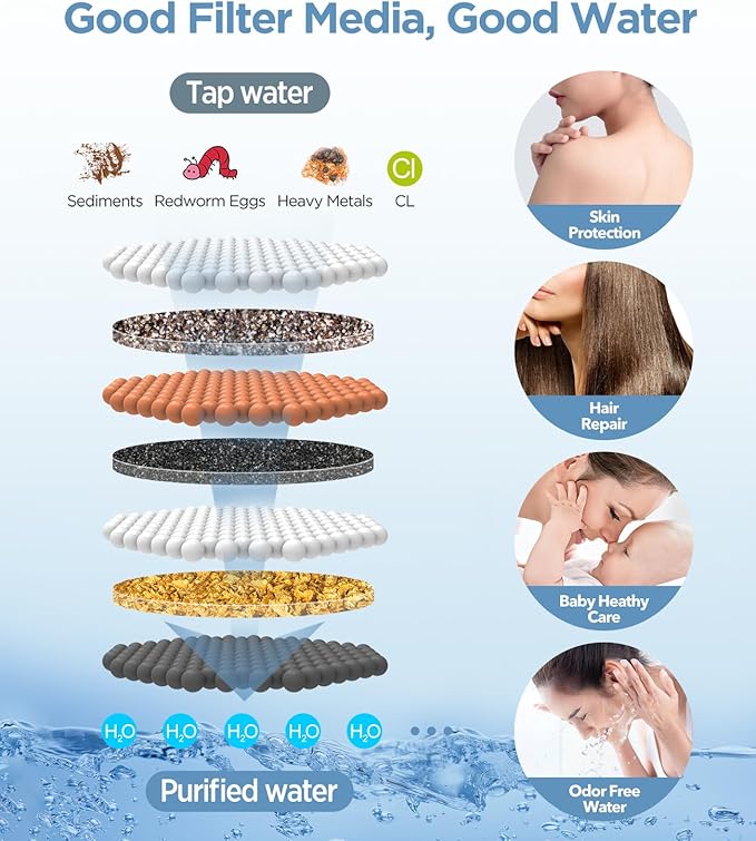 - 【Effective Filtration for Healthy Skin & Hair】MakeFit filtered shower head features a multi-stage filtration system with mineral stones and ceramic balls that effectively reduce chlorine, heavy metals, and other impurities. Designed for hard water, it helps minimize scale buildup, leaving skin less dry and hair smoother, offering daily protection for the whole family.