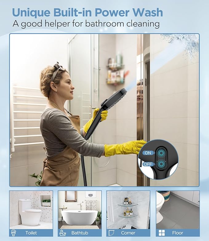 - 【6 Spray Settings + 1 Power Wash Modes】Switch between 6 versatile spray settings—Mist, Mist & Massage, Massage, Rain & Massage, Rain, and Rain & Mist—to suit your mood and needs. Simply press the button on the back to activate the high-pressure Power Wash mode, ideal for cleaning bathtubs, tiles, or pets quickly and efficiently.