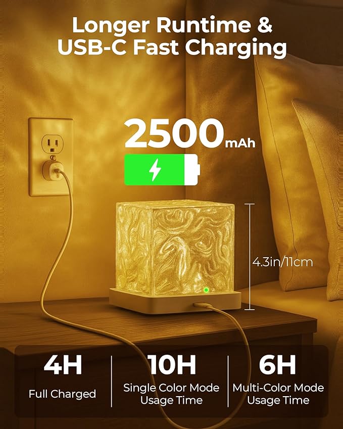 - ๐๐ฅ๐๐ง๐๐๐๐ ๐ฎ๐ฑ๐ฌ๐ฌ๐ข๐ผ๐ ๐๐ค๐ฃ๐-๐๐๐จ๐ฉ๐๐ฃ๐ ๐๐๐๐๐๐ง๐๐๐๐๐ก๐ ๐ฝ๐๐ฉ๐ฉ๐๐ง๐ฎ๐: Enjoy total freedom with a rechargeable, wireless designโsafe for bathroom use, with no outlets, no cords, no limits. Built with a high-capacity 2500mAh battery, it provides up to 10 hours of gentle, continuous light and fully recharges in just 4 hours. Perfect for creating a relaxing atmosphere in your bedroom, living room, kidsโ room, or spa cornerโanytime, anywhere.