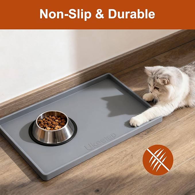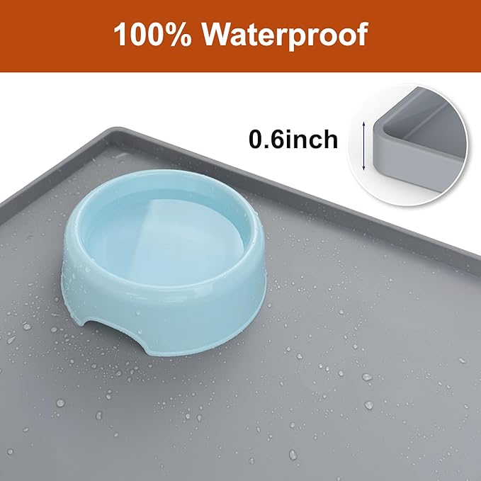 19” x 12” Heavy Duty Waterproof Silicone Mat with Raised Edge, BPA Free Non-Slip Dog & Cat Food Mat, Feeding Mat for Food and Water Bowls, Spill Proof Mat to Protect Floors, Gray