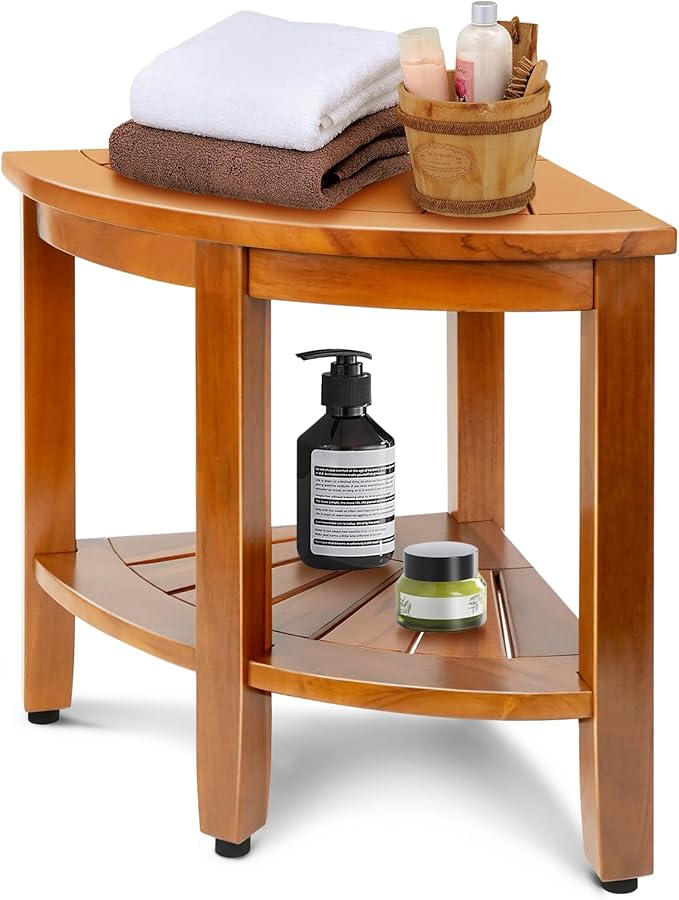 - MULTI-PURPOSE INDOOR & OUTDOOR USE: More than just a shower bench, it’s a stylish addition to any room. Use it in the bathroom, living room, or bedroom as a seat or display stand for towels, toiletries, books, or decor. The natural teak finish and elegant design enhance any space.