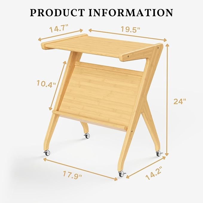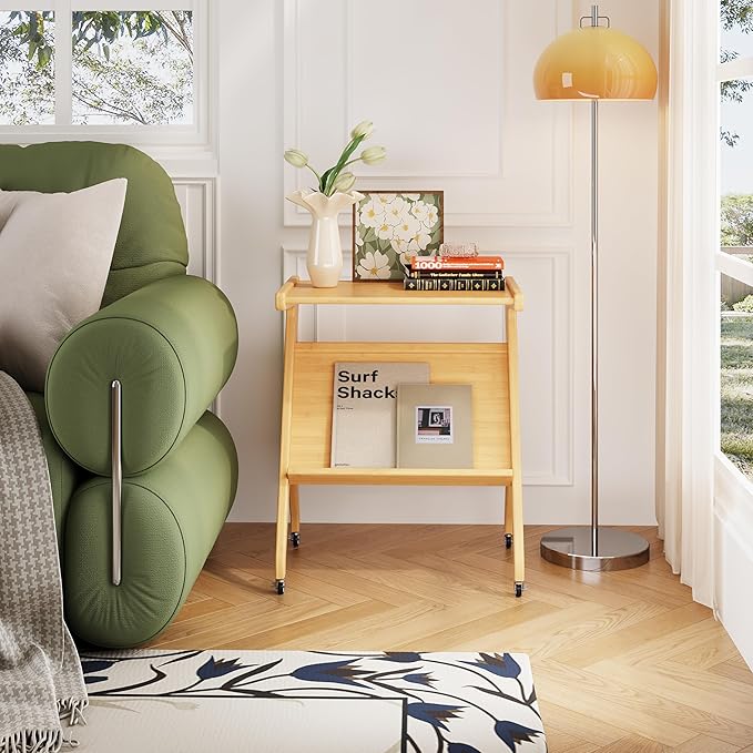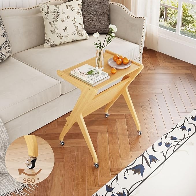 ZIYOO Solid Wood Mobile Side Table with Lockable Wheels, Multi-Functional Rolling End Table & Nightstand for Bedroom/Living Room, Small Spaces, Natural Bamboo